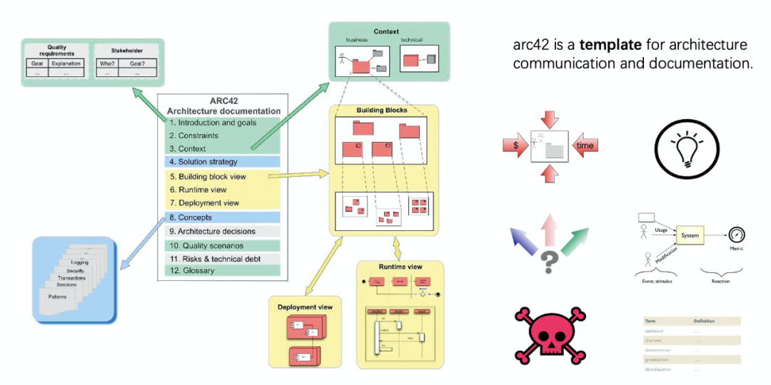 伟大的思想都是相似的,arc42 也不例外。上方左图的右侧部分,概括了 arc42 模板中与制图相关的几个核心章节,分别是: