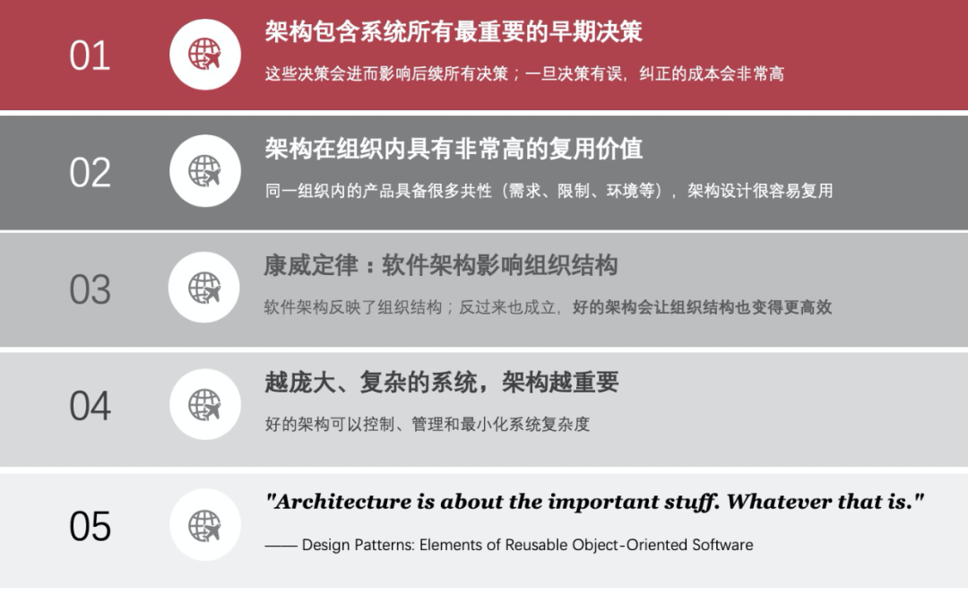 - 越庞大和复杂的系统,架构越重要,因为只有好的架构才能有效控制、管理和降低系统复杂度;