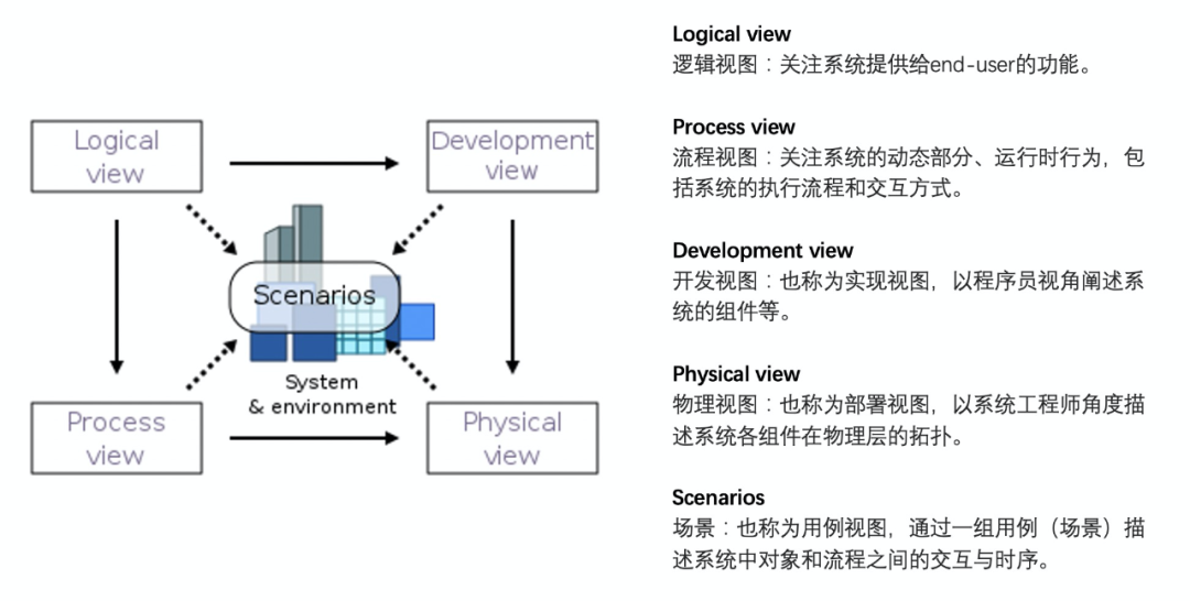 - 场景(Scenarios):通过一小组用例或场景来描述架构,包括系统中各种对象和进程之间的交互时序,也被称为“用例视图”。这些场景会被用于识别架构元素(architectural elements)以及阐述和验证整个架构设计,也可以被作为架构原型的测试起点。